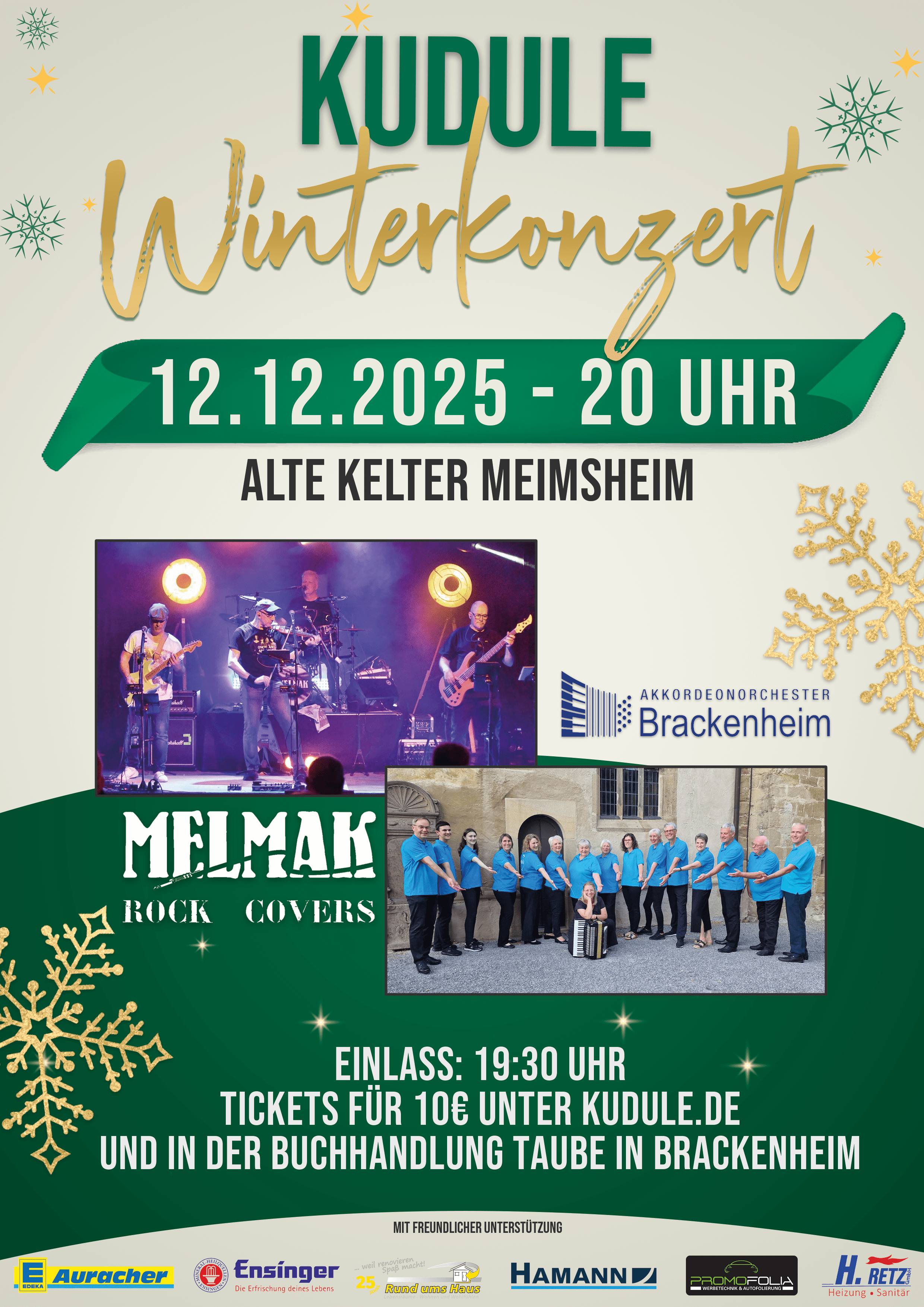 Am 12. Dezember 2025 feiern wir zum fünften Mal unser beliebtes Winterkonzert in der Alten Kelter Meimsheim. Freut euch auf einen besonderen Abend voller Live Musik, Emotion und winterlicher Stimmung. Den Auftakt macht das Akkordeonorchester Brackenheim, das mit klangvoller Vielfalt und beeindruckender Spielfreude begeistert. Danach sorgt die Band Melmak mit ihrem energiegeladenen Mix aus Rock, Pop und Funk für ordentlich Stimmung und ein Finale, das keiner so schnell vergessen wird. Einlass: 19.30 Uhr | Beginn: 20 Uhr Tickets: 10 Euro im Vorverkauf unter www.kudule.de oder in der Buchhandlung Taube, 12 Euro an der Abendkasse Getränkebewirtung vor und in der Pause Ein Abend voller Musik, Energie und guter Laune – wir freuen uns auf euch!
